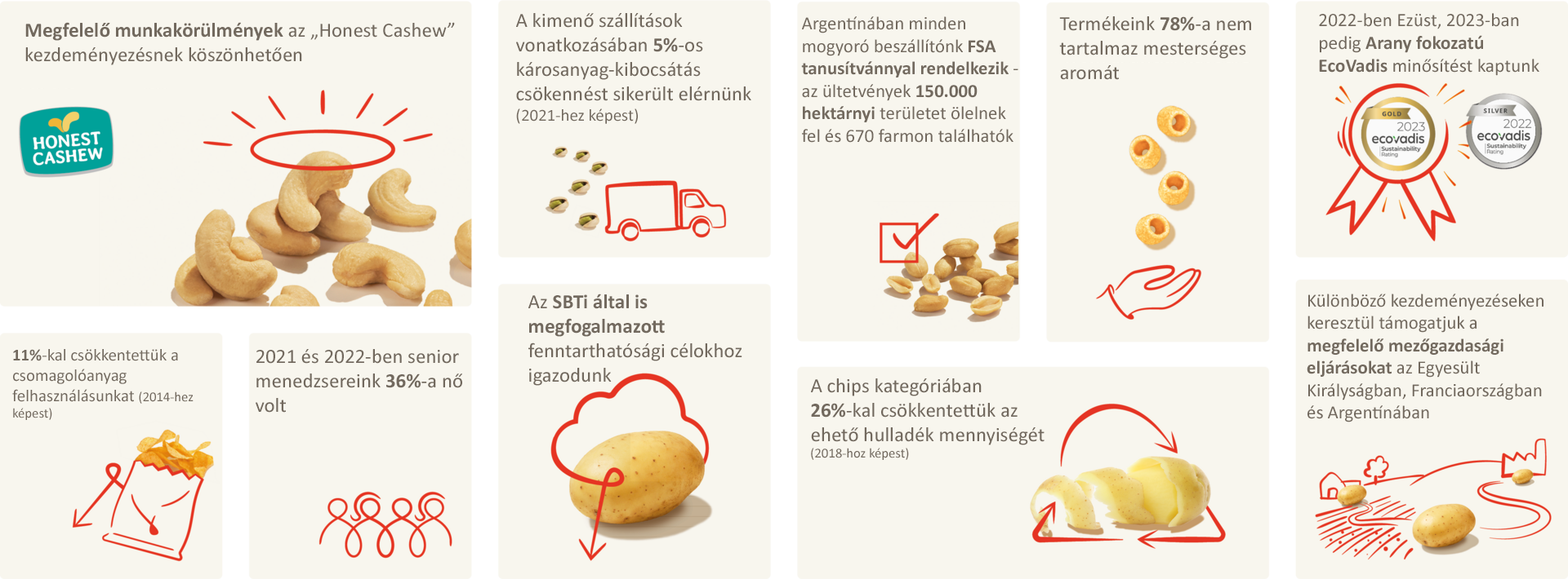 Az Intersnacknél hiszünk abban, hogy a kis lépések nagy változást eredményezhetnek. Ebben a jelentésben feltárjuk azokat a legutóbbi lépéseket, amelyeket mindannyian megtettünk annak érdekében, hogy működésünkben és ellátási láncunkban fenntartható változásokat hajtsunk végre.